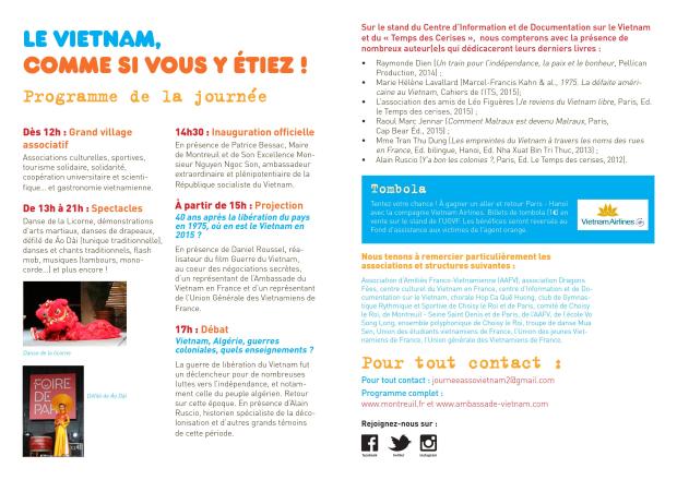 Chương trình dành cho tất cả mọi người (miễn phí) từ 12h đến 21h : gặp gỡ các hội đoàn, thảo luận, chiếu phim, đặc biệt là văn nghệ liên tục với sự tham gia của nhiều nghệ sĩ cộng đồng Việt-Pháp.