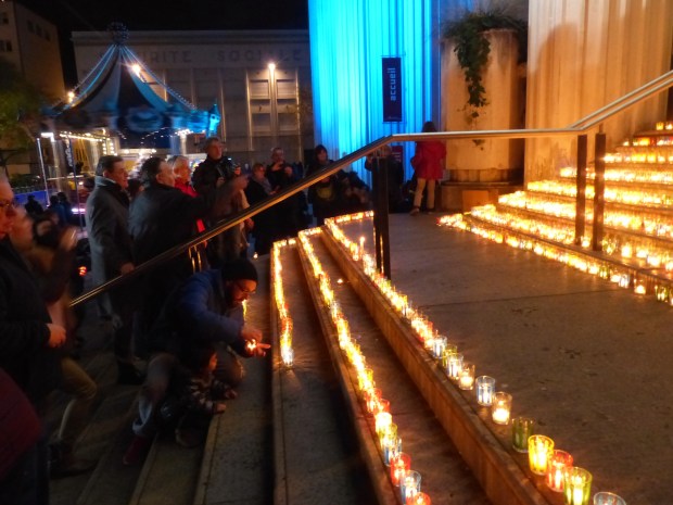 2015, en raison de l’état d’urgence imposé par les attentats de l’Etat Islamique-Daesch à Paris, le triste Vendredi 13 – Novembre, la Fête des Lumières de Lyon 2015 a été annulée ! Je comprends parfaitement cette décision, si douloureuse Vũ Hồng Nam (Lyon) pour l’économie locale, mais l’affluence dans les rues au centre-ville exposerait à un possible carnage due à quelques ‘fous djihadistes’. Ils étaient capables de crimes atroces même contre leurs coreligionnaires dans les pays arabes et africains ( leurs premières victimes par le nombre ) , par décapitation et crucification des condamnés , sans oublier les images de destruction des sites historiques de Palmyre, en Syrie , en Irak , en Afghanistan, au Mali …Ce 8 Décembre 2015 je suis venu me recueillir devant la Mairie de Villeurbanne en pensant aux 130 victimes tués froidement, pour la plupart des jeunes , plusieurs centaines de blessés , et à leurs familles profondément touchées .