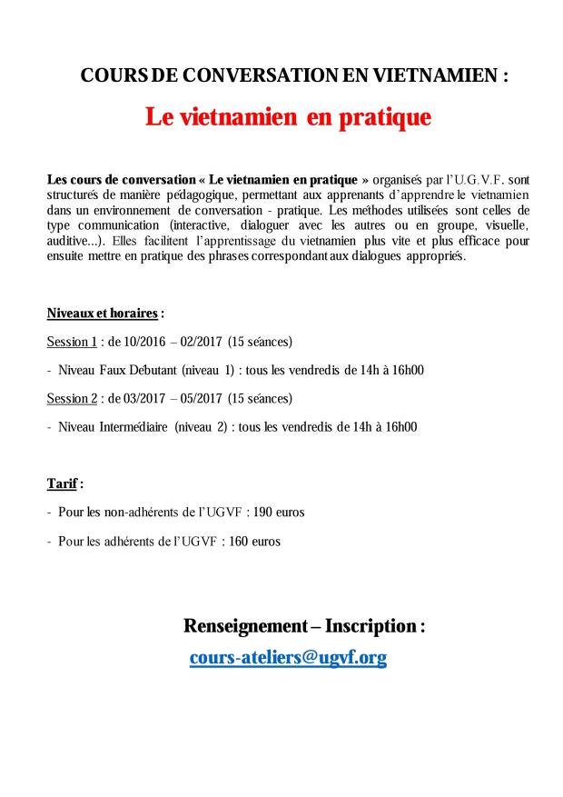 Les cours de conversation « Le vietnamien en pratique » organisés par l’U.G.V.F. sont structurés de manière pédagogique, permettant aux apprenants d’apprendre le vietnamien dans un environnement de conversation – pratique. Les méthodes utilisées sont celles de type communication (interactive, dialoguer avec les autres ou en groupe, visuelle, auditive…). Elles facilitent l’apprentissage du vietnamien plus vite et plus efficace pour ensuite mettre en pratique des phrases correspondant aux dialogues appropriés.