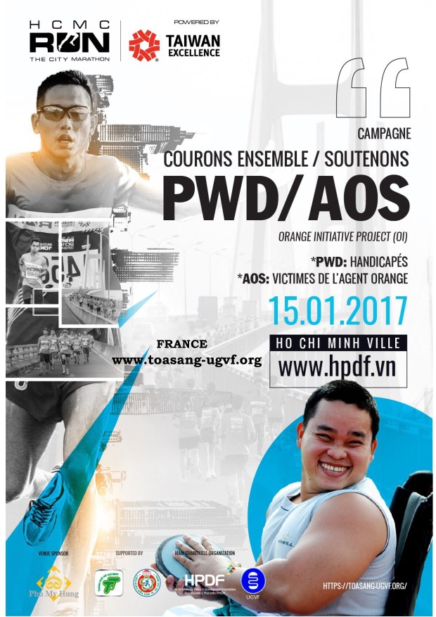 Soutenons les personnes handicapées et victimes de l’Agent Orange (PWD/AOS) en participant au projet Orange Initiative et HCMC Run Le City Marathon 2017! Vous pouvez dès maintenant vous joindre à cet événement de la ville (10% de vos dons seront verés au fonds PWD/AOS) et/ou participer à une course de 1 ou plus de 5km, ou bien faire un don à http://www.oi.hpdf.vn.