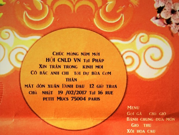 Hội Công nhân và người Lao động Việt Nam tại Pháp xin trân trọng kính mời cô, bác, anh, chị tới dự bữa cơm thân mật đón xuân Đinh Dậu,