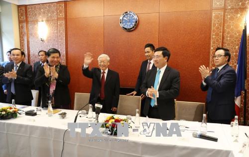 Thay mặt nhân dân Việt Nam, Tổng Bí thư Nguyễn Phú Trọng bày tỏ lòng biết ơn nhân dân tiến bộ Pháp đã đoàn kết, ủng hộ, giúp đỡ Việt Nam trong suốt những năm qua và ngày nay quan hệ hai nước tiếp tục phát triển, có nhiều triển vọng tốt đẹp. Nhân dân Việt Nam mãi ghi nhớ và biết ơn những người con ưu tú của Pháp, những người đồng chí, anh em thân thiết như Henri Martin, Raymonde Dien… và rất nhiều tên tuổi khác. Điều đó cho thấy quan hệ hai nước rất sâu sắc. Chuyến thăm Pháp lần này của Đoàn nhằm thúc đẩy, tăng cường các lĩnh vực hợp tác song phương, trong đó có giao lưu và hợp tác giữa các địa phương hai nước.