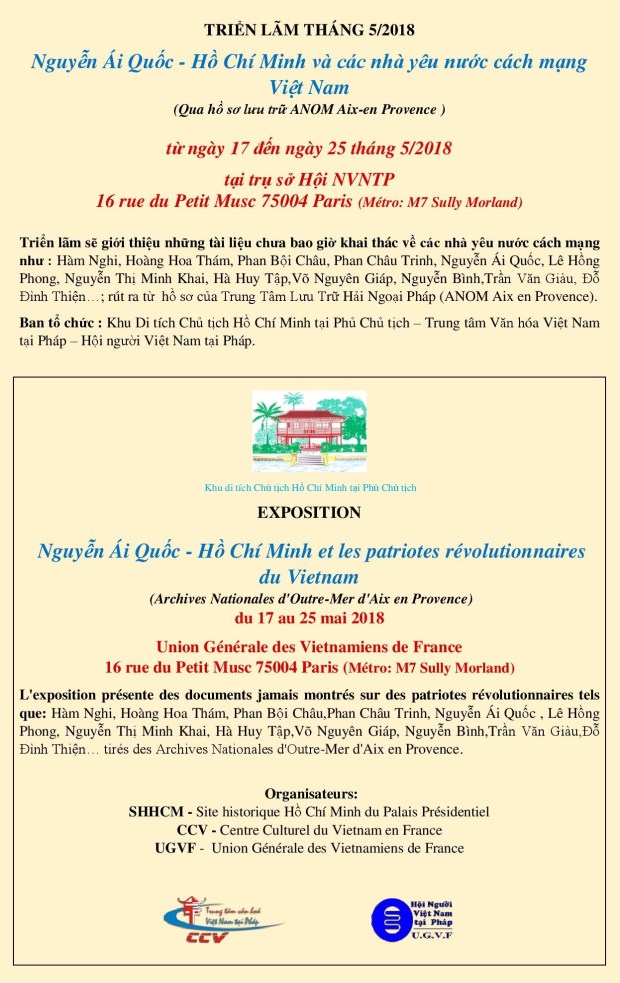 NDĐT – Tối 17-5, triển lãm về những tư liệu, hình ảnh liên quan đến cuộc đời và hoạt động của Chủ tịch Hồ Chí Minh và các nhà yêu nước cách mạng Việt Nam được khai mạc tại Trụ sở của Hội người Việt Nam tại Pháp ở thủ đô Paris. Đây là những tài liệu, hình ảnh lần đầu tiên được giới thiệu tới công chúng ở Pháp.