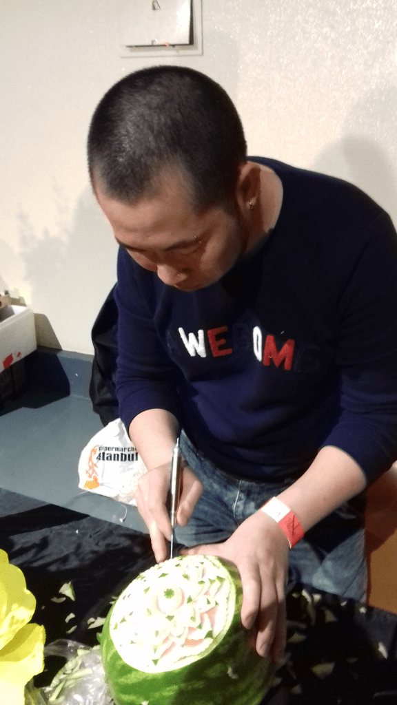 Ngay tại phòng sảnh, trước khu giữ áo khoác, tại gian hàng trang trí các lẵng hoa chào mừng, ai ai cũng chú ý đến anh Dương Quốc Phong, một người Việt mới sang làm việc từ 3 năm nay, có ngón tay rất điêu luyện đã dùng dao nhọn khắc lên trái dưa hấu những hình vẽ vô cùng sắc sảo.