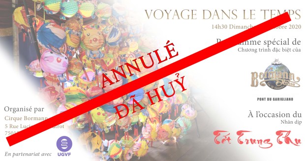 Dans le contexte actuel de la propagation du Coronavirus et suite aux directives gouvernementales, nous avons décidé d’annuler la fête de la mi-automne. Toutes les personnes ayant déjà acheté leurs billets sur notre billetweb seront intégralement remboursées sur leur carte bancaire. Cependant le cirque Bormann maintient sa représentation de son spectacle « Voyage dans le temps » ouverte au public dans le respect des mesures d’hygiène et de distanciation sociale. Vous pouvez réserver des billets sur leur site ci dessous. Nous nous excusons d’avance pour les désagréments encourus et vous remercions de votre compréhension. Nous tenons à remercier le Centre culturel du Vietnam en France ainsi que notre sponsor Thanh Binh Jeune pour leur soutien.
