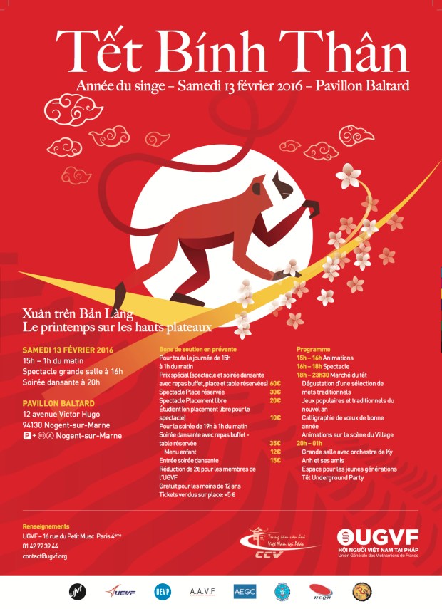 Vào 15h thứ bảy ngày 13 tháng 2 năm 2016, cũng đúng mùng 6 Tết Việt Nam, sự kiện Tết Bính Thân với chủ đề « Xuân trên bản làng » đã chính thức bắt đầu và kéo dài đến 1h sáng hôm sau tại Pavillon Baltard – công trình kiến trúc lịch sử và văn hóa nổi tiếng của Pháp. Năm nay, sự kiện do Hội người Việt Nam tại Pháp và Trung tâm văn hóa Việt Nam tại Pháp đồng tổ chức, cùng với sự tham gia tổ chức của gần 10 hội đoàn khác trong cộng đồng Việt Nam tại Pháp cùng các nhà tài trợ (UEVF, UEVP, UJVF, AAVF, Võ Sơn Long, Hợp ca Quê hương, Đồng Hành, AEGC, Basket PBT,…)..