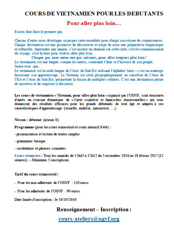 Les cours de vietnamien « Vietnam, pour aller plus loin » organisé par l’UGVF, sont structurés d’après un concept dynamique de « Carte cognitive et Approches émotionnelles » qui vous donneront des résultats efficaces pour les grands débutants de tout âge et adaptés à vos caractéristiques d’apprentissage (visuelle, auditive, interactive, …).