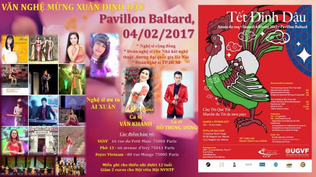 Tham gia chương trình Văn nghệ Tết Xuân Đinh Dậu, ngoài các tiết mục tập thể được đầu tư, tập luyện công phu từ nhiều tháng nay của trường thiếu nhi Về nguồn, UJVF, Võ Sơn Long, còn có các giọng ca được nhiều thế hệ cộng đồng Việt Nam tại Pháp yêu chuộng như Ái Xuân, Thanh Tâm, Trung Hiếu, Quốc Việt, đặc biệt, lần đầu tiên từ nhiều năm nay, có sự tham gia của cả hai đoàn từ Việt Nam sang: đoàn nghệ sĩ Nhà hát nghệ thuật đương đại quốc gia từ Hà Nội do Đạo diễn-Nghệ sĩ ưu tú Trần Bình làm trưởng đoàn, và các nghệ sĩ từ TP. HCM như: ca sĩ Vân Khánh, nhóm Giao thời, nghệ sĩ vọng cổ Trần Thu Vân.