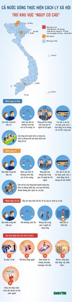 Theo quyết định của Thủ tướng Chính phủ, kể từ ngày 23/04/2020, 28 tỉnh thành thuộc nhóm “nguy cơ cao” và “có nguy cơ” bùng phát dịch Covid-19 được chính thức ngừng thực hiện cách ly xã hội như quy định của Chỉ thị 16. Cả nước chỉ còn một số huyện của Hà Nội, Hà Giang, Bắc Ninh có người mắc Covid-19 là được xếp vào « nhóm nguy cơ cao » về dịch bệnh. Những nơi « có nguy cơ » sẽ tiếp tục thực hiện chỉ thị 15 (không yêu cầu cách ly xã hội).