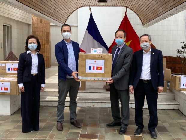 Ngày 7-5, tại Đại sứ quán Việt Nam tại Pháp, Đại sứ nước ta Nguyễn Thiệp đã trao tặng khẩu trang y tế cho các hội đoàn và chính quyền địa phương. Hơn 15.000 chiếc khẩu trang đã được chuyển đến Hội người Việt Nam tại Pháp (UGVF), Hội sinh viên Việt Nam tại Pháp (UEVF), Hội hữu nghị Pháp-Việt, các nhóm nghi sĩ hữu nghị Pháp-Việt tại Hạ viện và Thượng viện, Đảng Cộng sản Pháp, các Tòa thị chính Paris, Montreuil  và Choisy-le-Roi, cùng nhiều bạn bè, đối tác sở tại khác.